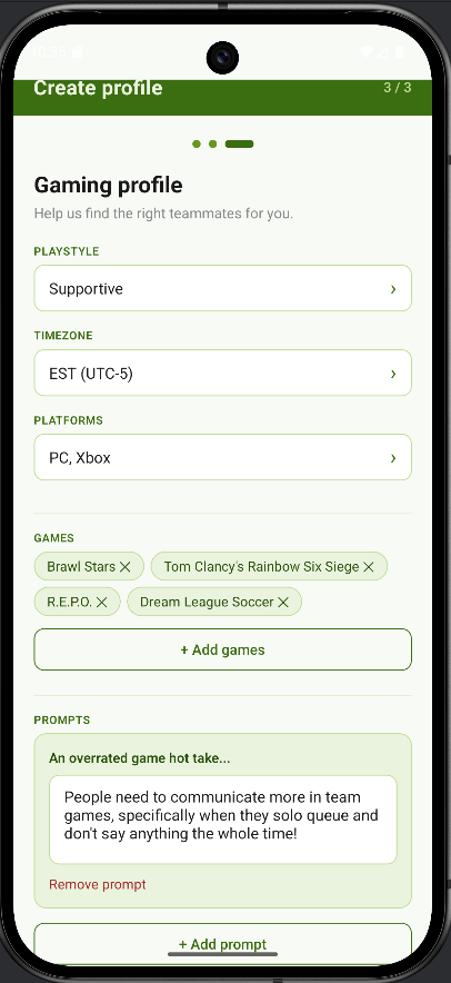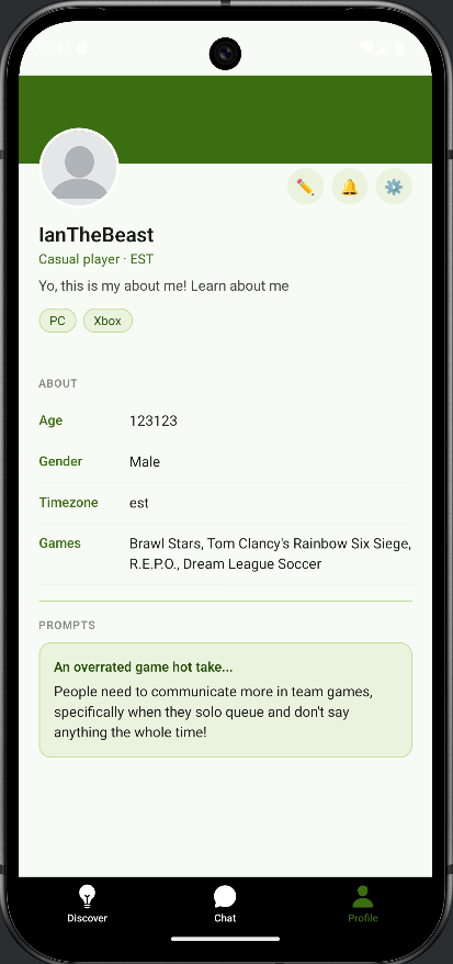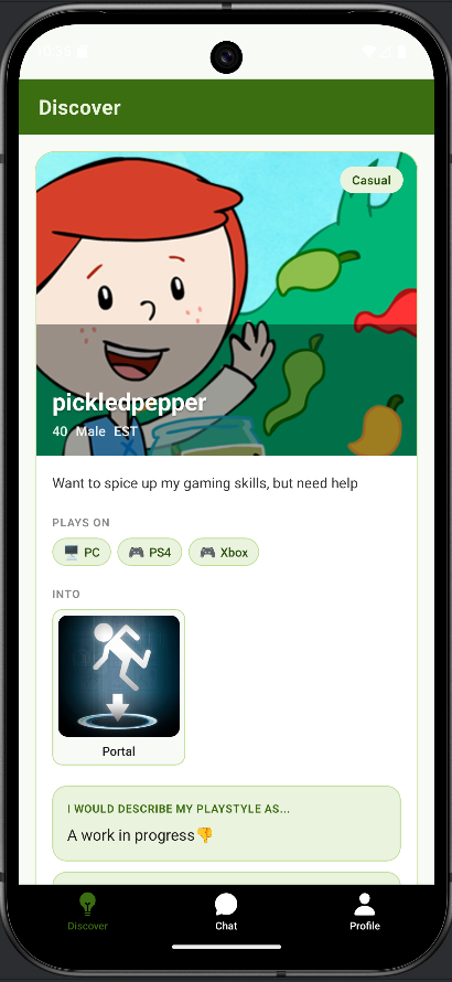 Our app uses a matching algorithm to show people with similar interests and playstyles, and keep the negative bullies away. Your score is based on: